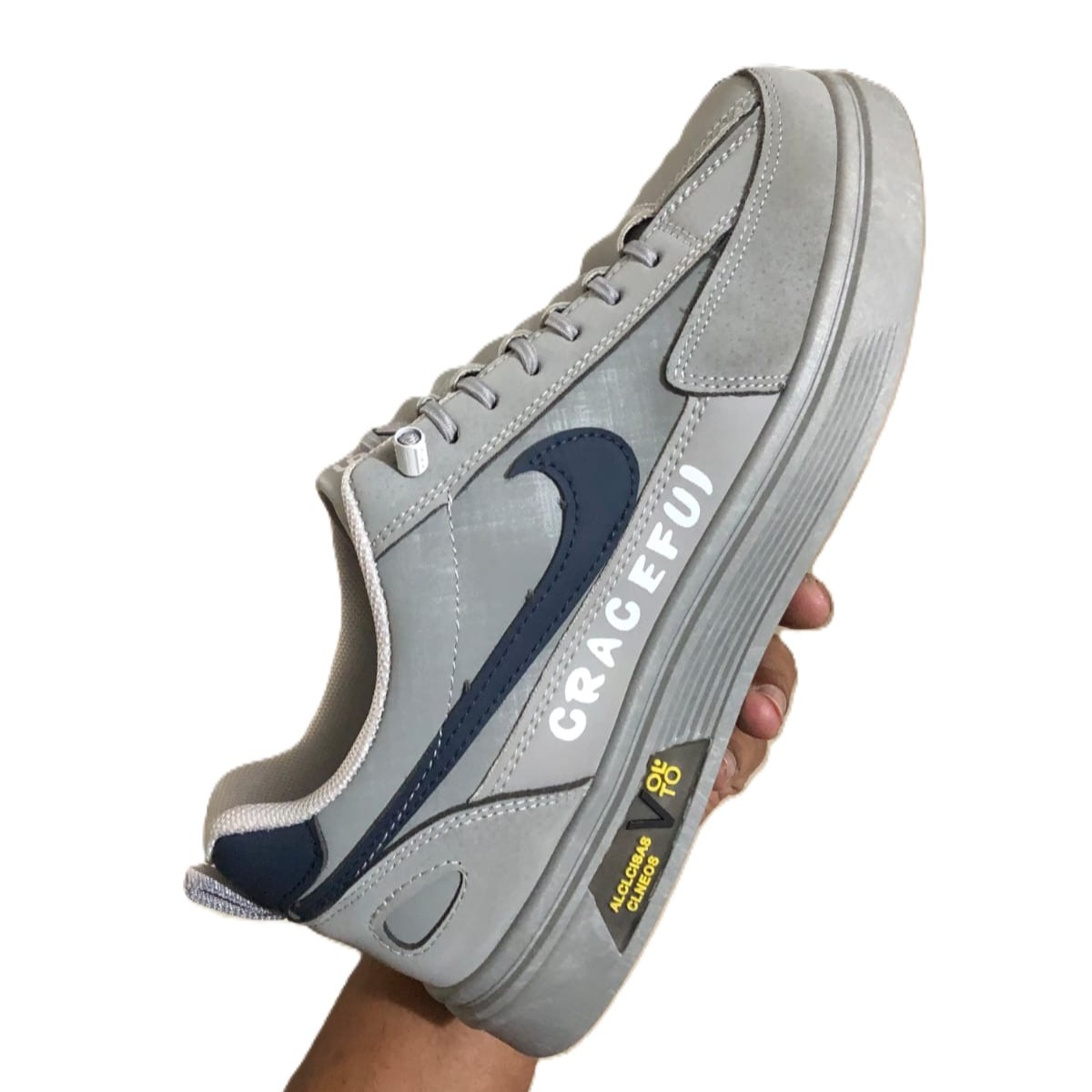 Signature Styling: A textured grayscale palette accented by a navy-blue “Swoosh” and bold “GRACEFUL” midsole lettering.